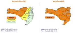No Planalto Sul e Vale do Itajaí, o risco é considerado moderado. Já no litoral, os temporais tendem a ser mais isolados, com menor intensidade.