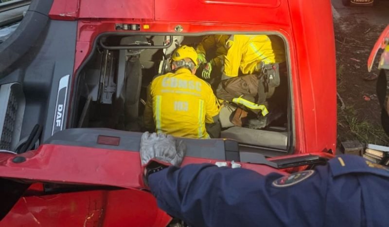 O condutor do caminhão betoneira foi encontrado preso às ferragens. Devido à gravidade da ocorrência e à cabine completamente destruída, os socorristas realizaram uma operação complexa de desencarceramento.